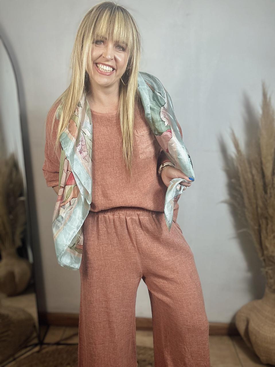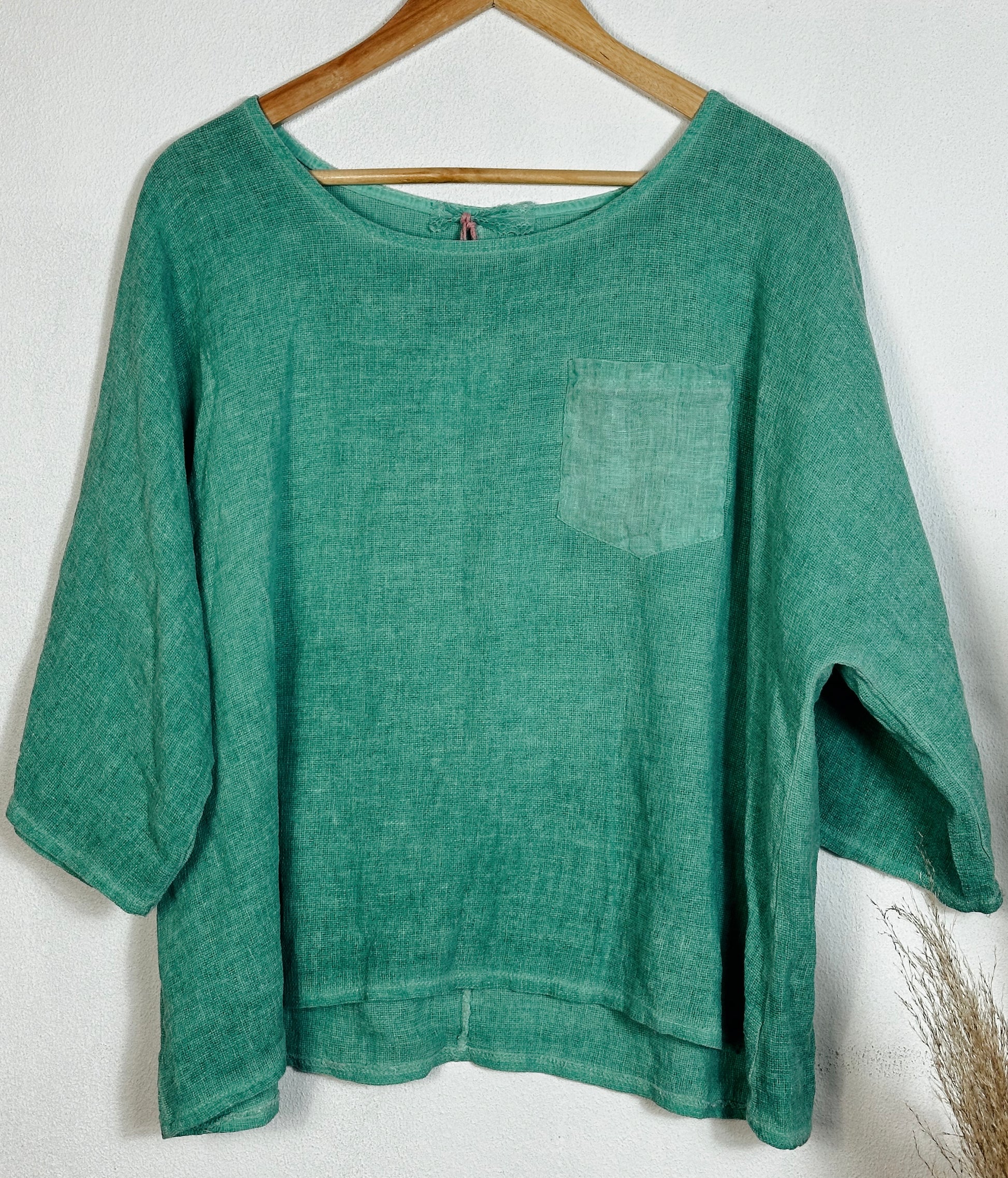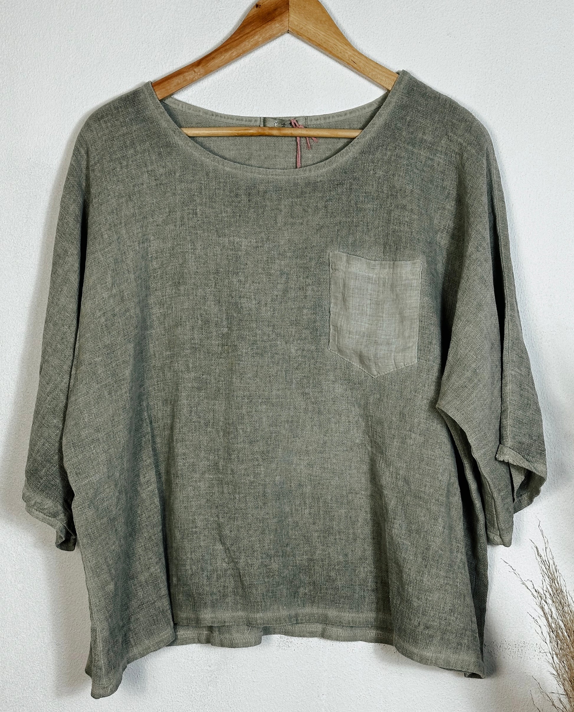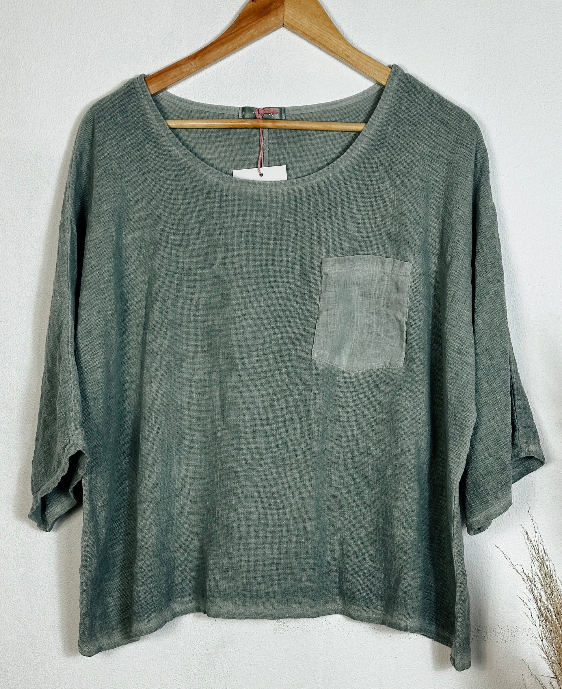 A lightweight, loose-fit linen top perfect for effortless style and comfort. Designed with a wide round neckline, ¾ sleeves, and a contrasting chest pocket for a touch of detail. Comes in various colours to suit your style.